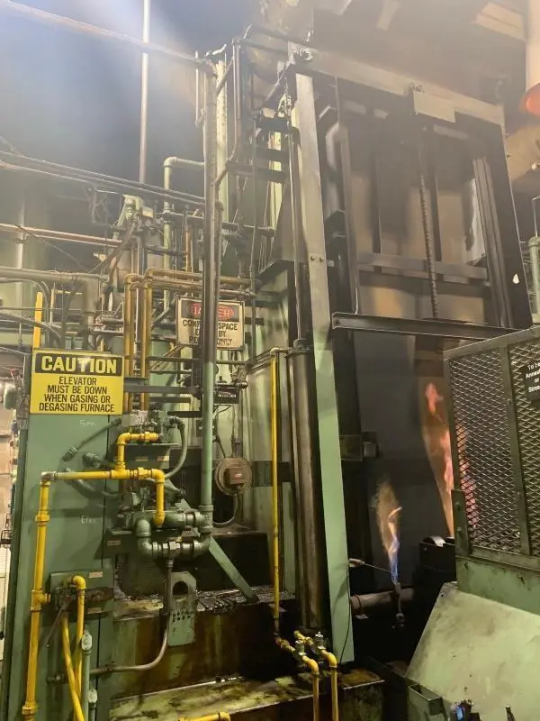 Atmosphere: Natural gas, ammonia, air, endo for furnace & top cool, natural gas, nitrogen for furnace purge